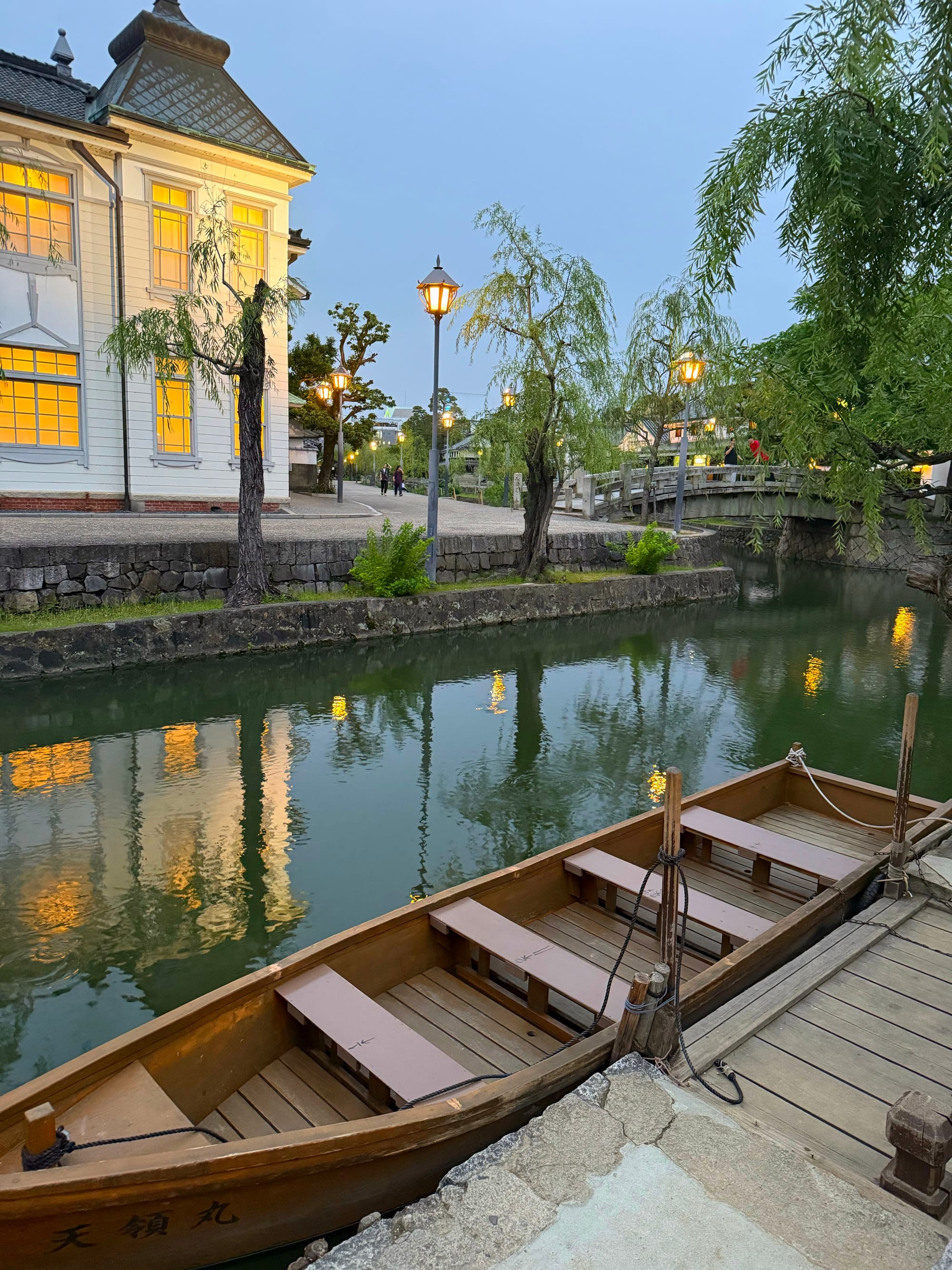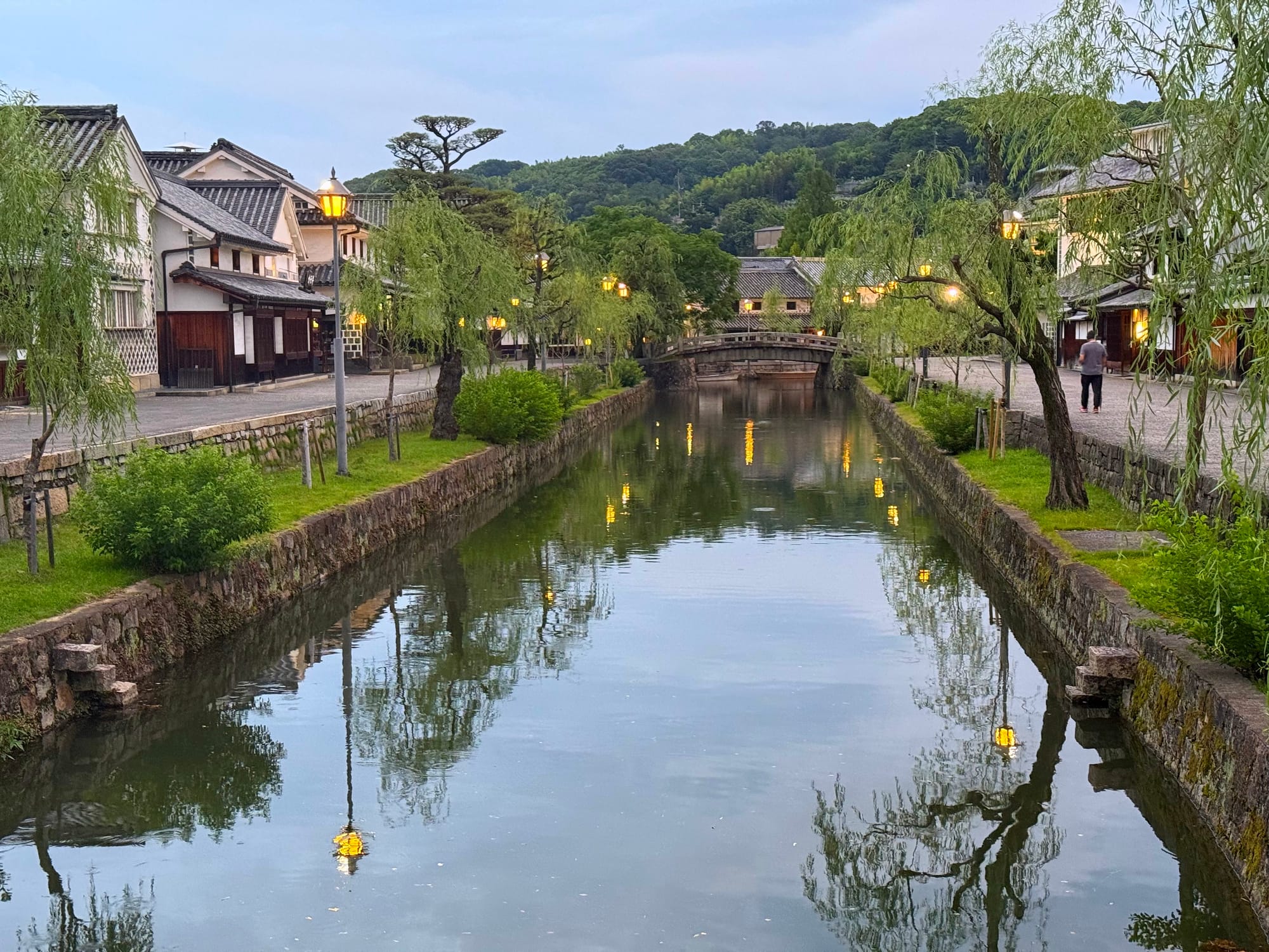 4 hours and 3 trains got me to Kurashiki (pronounced something like Ku-ras-key), a small city near Okayama. It has a historic canal zone, which was mostly closed by the time I got there, but still very pretty to walk around.